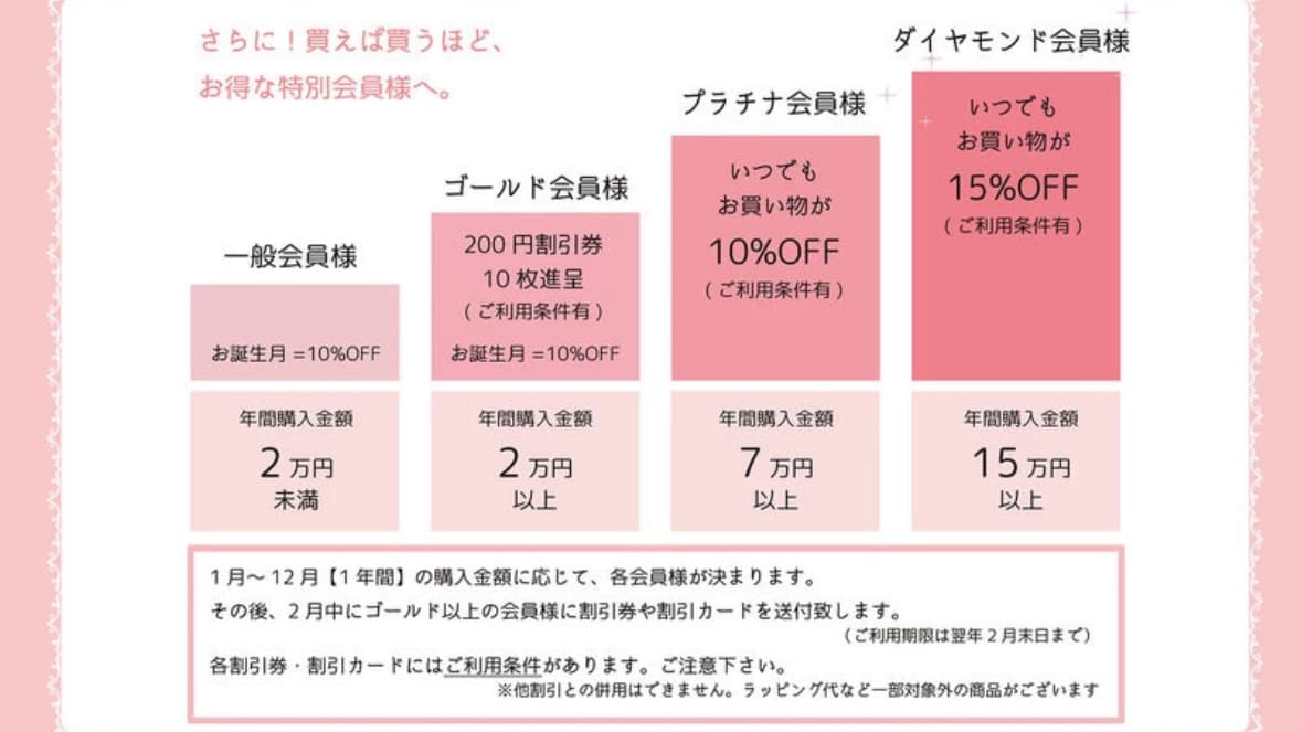 ・ゴールド会員(2万円以上):誕生月10%OFF + 200円割引券×10枚(条件あり)